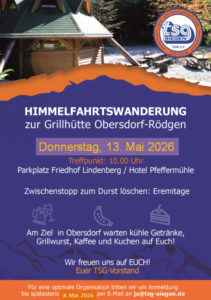 Unsere traditionelle Himmelfahrtswanderung zur Grillhütte Obersdorf-Rödgen steht an – und alle TSG-Mitglieder und ihre Familien sind herzlich eingeladen!