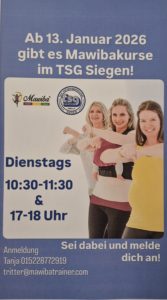Im neuen Jahr kooperieren wir mit der Mawiba-Trainerin Tanja Ritter und bieten ab dem 13. Januar dienstags zwei Mawibakurse an.